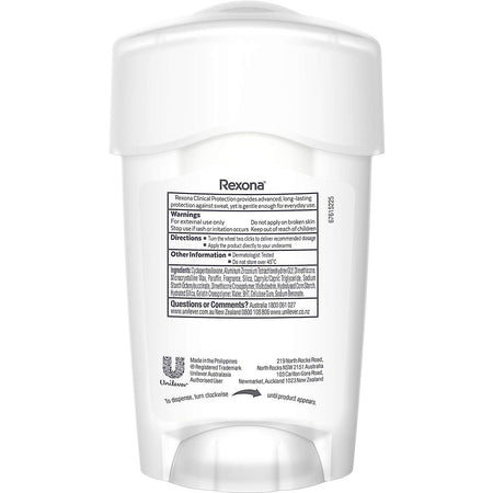 Gentle Dry Clinical Protection for women offers up to 3 times more wetness protection than a basic antiperspirant deodorant, yet is gentle enough for everyday use. Keep confident with its discreet fragrance and stay dry with Rexona's most advanced formulation. Our products are intelligently designed to work as hard as you do. We make it our business to know more about sweat, and what we learn informs every product innovation. Sweat, also known as perspiration, is a normal and healthy bodily function and it starts to occur just a few months after birth. We mainly sweat to cool our bodies down, a process called thermoregulation. Our brain sends a signal to over 3 million glands in our body to release sweat (a clear fluid made of water, salts and proteins). As this fluid evaporates from our skin, it lowers our body temperature. On https://www.rexona.com/au you'll find lots of helpful information about how to stop sweat and how Rexona can help. Rexona entered the world of professional sports, backing some of the world's best sports men and women. To this day, Rexona continues to provide ultimate protection at even the busiest of times. Rexona was created in Australia in 1908 by Mrs Alice Sheffer, the wife of SF Sheffer, the founder of the Sheldon Drug Company. A talented physician, she wanted to give people a new kind of personal care product, with effective ingredients that also smelt good. When Rexona hit the shelves in 1908, it soon became the company's biggest sellerSize: 45ml