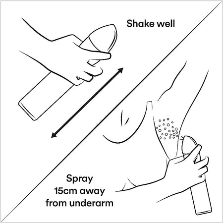 Shake well before use. Hold can 15cm from underarm and spray. Do not apply to broken or sore skin. Stop use if irritation develops. Do not spray near eyes or face.