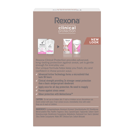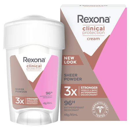Sheer Powder Clinical Protection for women offers up to 3x more wetness protection than a basic antiperspirant deodorant, yet is gentle enough for everyday use. This deodorant has clinical wetness protection with an odour fighting technology. Keep confident with freesia, jasmine and creamy vanilla scents and stay dry with Rexona's most advanced formulation Our products are intelligently designed to work as hard as you do.