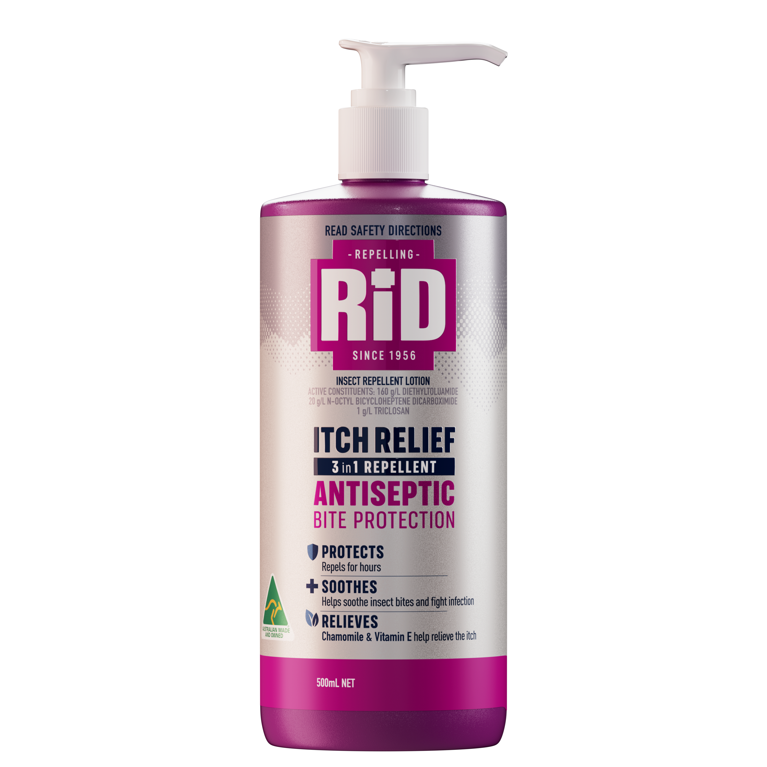 Repel, soothe and heal. Repellent + antiseptic enhanced with soothing chamomile and vitamin E to protect against insect bites and skin infections.