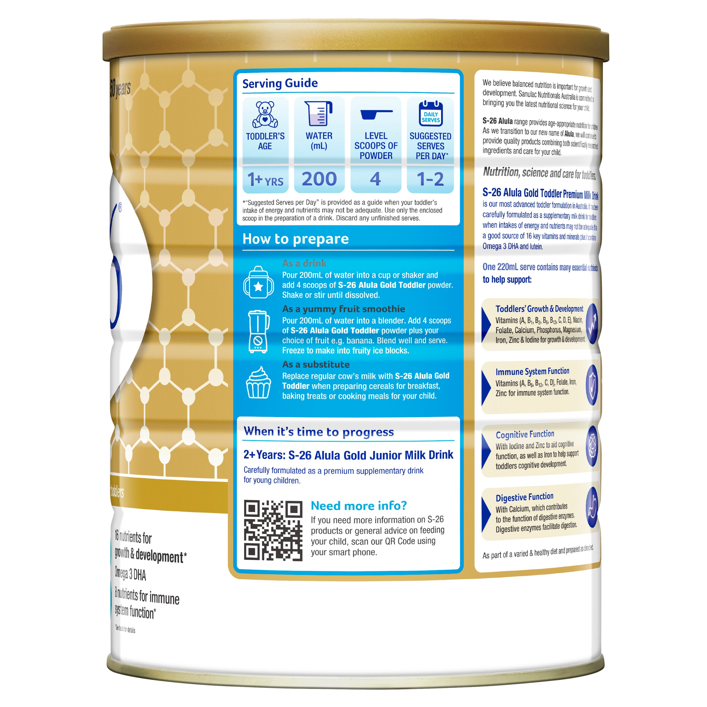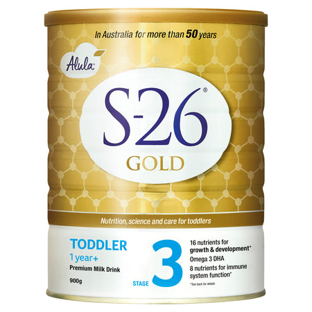 S-26 Alula Gold Toddler Premium Milk Drink is our most advanced toddler formulation in Australia. It has been carefully formulated as a supplementary milk drink for toddlers when intakes of energy and nutrients may not be adequate. It is a good source of 16 key vitamins and minerals plus it contains Omega 3 DHA and lutein.