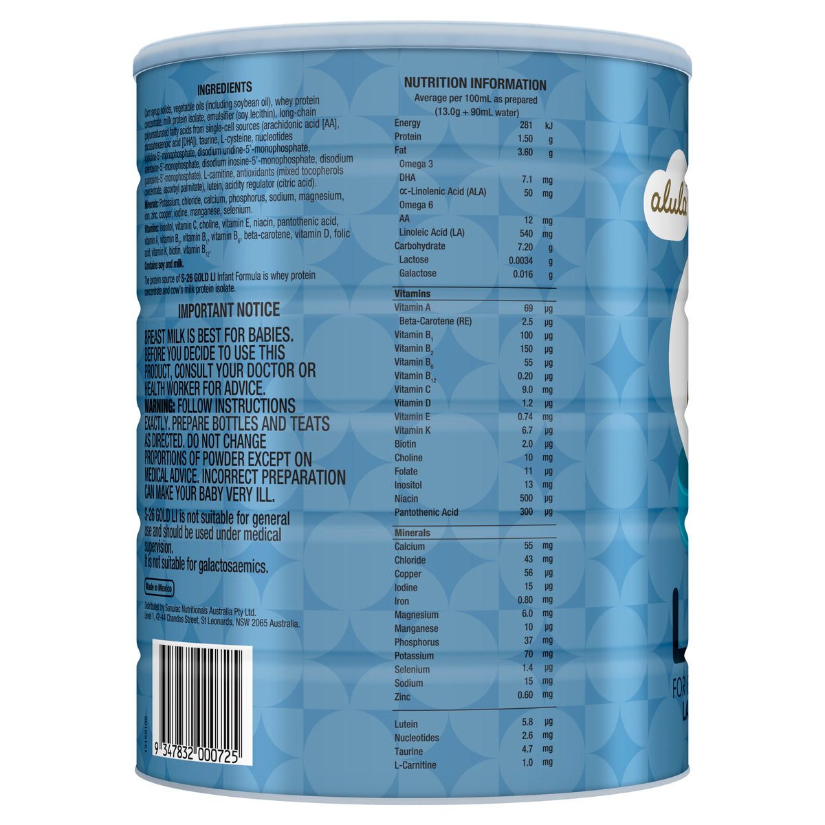 Alula S-26 Gold Lactose Intolerance is a premium, nutritionally complete, specialty infant formula for babies from birth who are lactose intolerant or unable to properly digest lactose.