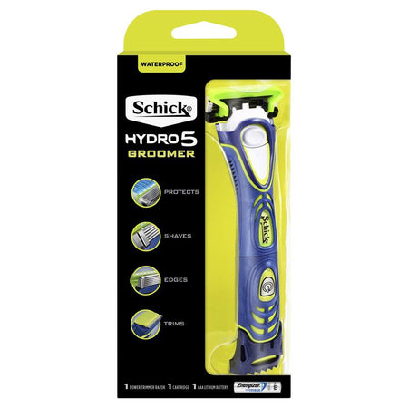 The Schick Hydro 5 Groomer is the only 4-in-1 high performance styling tool that shaves, hydrates, trims, and edges. With a razor on one end and an adjustable power trimmer on the other, this convenient tool eliminates the need for multiple attachments – it’s all right there.(throughout each shave)
