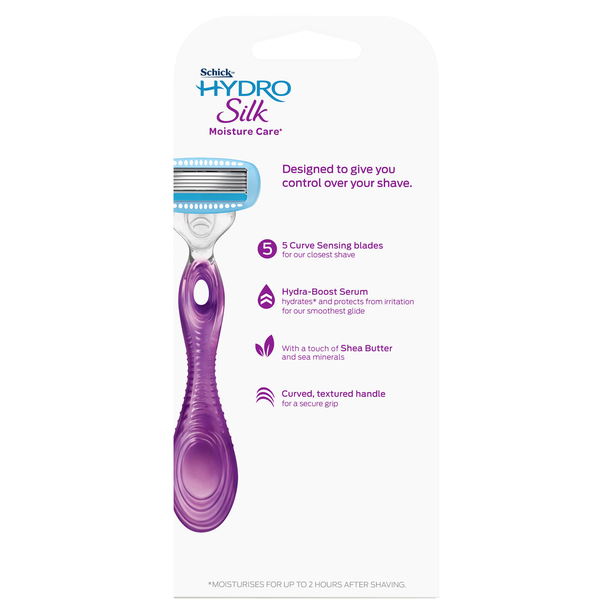 The Schick® Hydro Silk® Razor features water-activated Hydra-Renew™ serum formulated with shea butter. Its 5-curve sensing blades give you incredible closeness, while following the natural shape of your body. The cartridge is just the right size for accessing hard-to-reach areas, and each blade includes unique skin guards to smooth skin and help prevent irritation.Size: 1 x handle, 2 x blades.