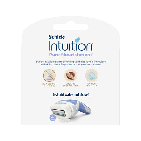 Schick Intuition Pure Nourishment Refills with coconut milk and almond oil to moisturise and help soften skin during shaving. The refills also feature a 4-blade pivoting head to glide smoothly along the contours of your legs and body. Intuition Pure Nourishment Refills are compatible with any of our Intuition razor handles.CPP