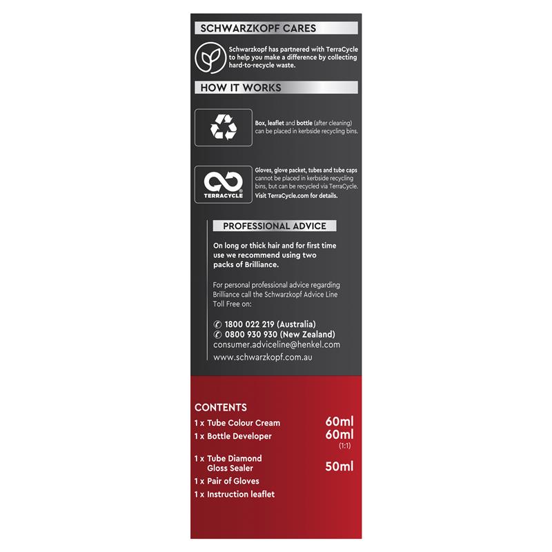 Boxed Contents: 1 Tube Brilliance Colour Creme 60mL, 1 Capsule Diamond Gloss Serum 1 mL, 1 Developer Bottle 60mL (1:1), 1 Sachet Brilliance Colour-shine Conditioner 22.5mL, 1 Pair of gloves, 1 Instruction leaflet.