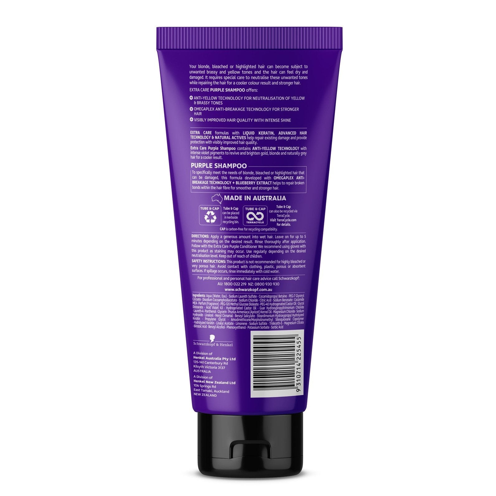 Schwarzkopf Extra Care Blonde Purple Shampoo removes yellow & brassy tones, strengthens for visibly improved hair quality with anti-yellow technology.