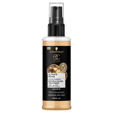 Schwarzkopf Extra Care Ultimate Repair & Gloss Treatment is a light and easy spray containing liquid keratin which helps to fill the gaps in the hair cuticle repairing the hair from the inside to the surface using identical particles.