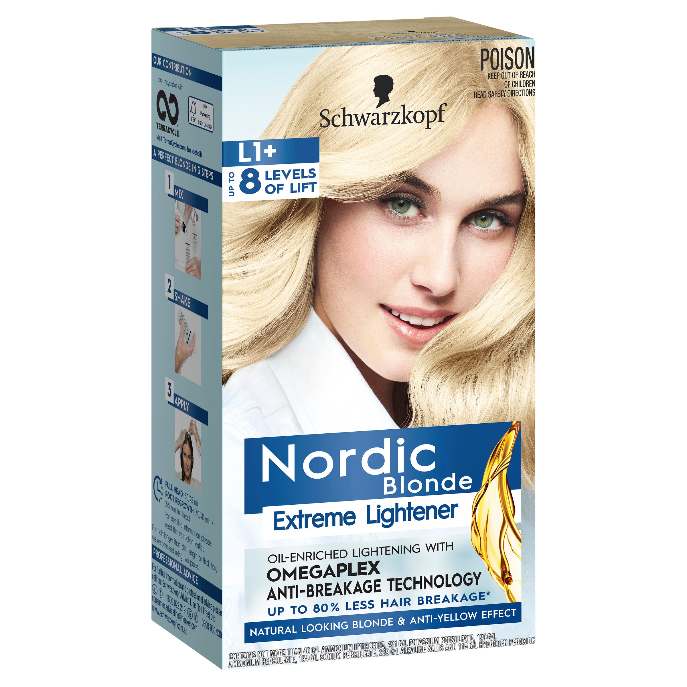 Schwarzkopf Nordic Blonde gives intensive lightening performance, up to 8 levels of lift and a great anti-yellow effect. The oil-powered formula combined with professional anti-breakage technology. It strengthens micro-bonds inside the hair fibre against damage.
