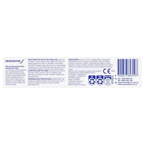 Sensodyne Rapid Relief Extra Fresh is clinically proven to relieve sensitivity pain at just 60 seconds whilst leaving your mouth feeling clean and fresh.*Its unique formula quickly creates a barrier over the sensitive areas of your teeth. It that provides fast acting relief and builds ongoing protection with every brush. It also whitens enamel and prevent staining. For rapid relief and long-lasting protection, plus an extra fresh feeling, try Sensodyne Rapid Relief Extra Fresh.*Apply a pea-sized amount to a clean finger-tip and rub gently into each sensitive tooth (Max. twice per day) for 1 minute.