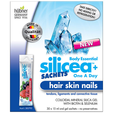 Silicea+ One a Day Sachets are the newest and most convenient way to take silicea gel for skin, hair and nails yet! No refrigeration required! No Mixing required! Enjoy 420mg of biotavailable silicea (same as the daily intake of Silicea from our capsule or bottle) in a ready-to-go beauty shot sachet with a tear-off tab. With added Biotin and Selenium as well as the great taste of mixed berries.