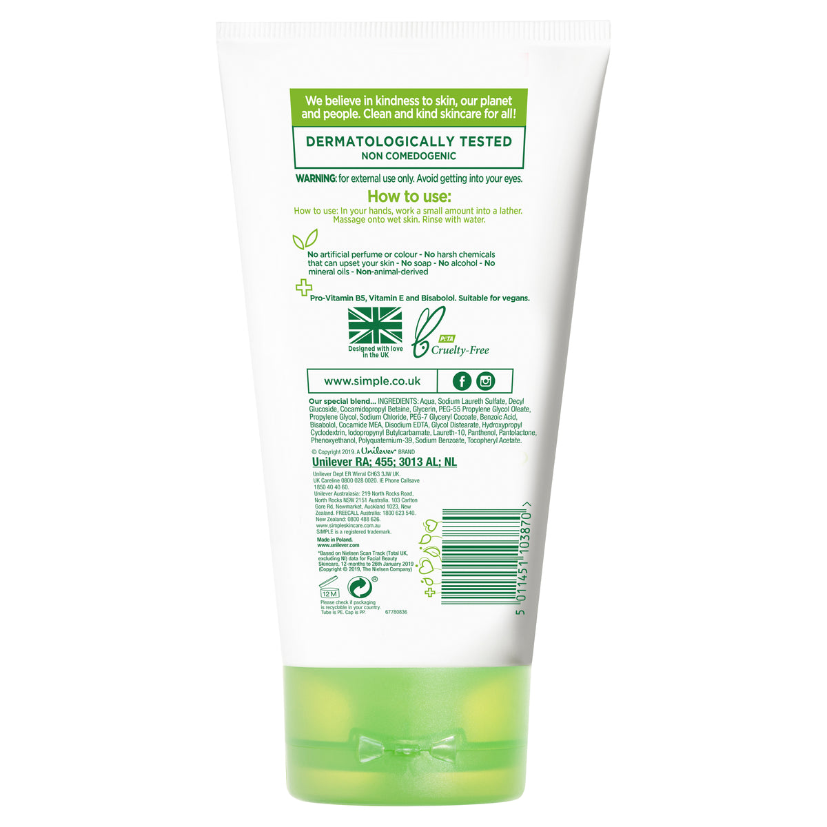 • This moisturising face wash is vegan and Simple is certified cruelty-free by PETA, meaning we don't test on animals anywhere in the world.