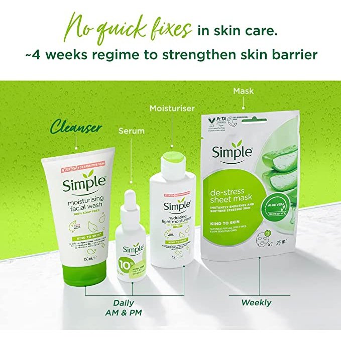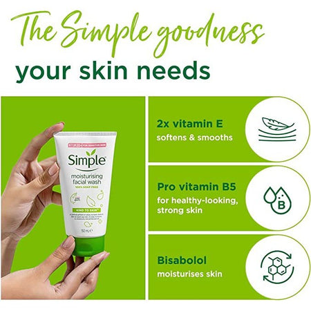 Who doesn't want to have clean and soft hydrated skin? Now you can with our Simple Kind to Skin Moisturising Facial Wash Gel. It hydrates while cleansing and exfoliating; washing away impurities without leaving your skin feeling tight or dry. It's TLC for your face. Our Simple face wash helps maintain the skin's natural barrier, which is so important when you're outside dealing with everyday pollution. Specially formulated for even the most sensitive skin, our facial wash contains no artificial perfume or colour, no alcohol, and no harsh chemicals that can upset your skin. Enriched with vitamin B5, which is known to actively restore, soften, and smooth skin; this skin cleanser is also perfect for dry skin. Our Simple wash formula doesn't clog pores, is hypoallergenic and it's safe to use around your eyes. It's 100% soap-free and, like all our Simple face products, this face wash is dermatologically tested. We believe in continuously working to be kinder to the planet. That's why this cleanser is vegan and Simple is certified cruelty-free by PETA, meaning we don't test on animals anywhere in the world. Want to know how to get the most out of your face wash? Use it in the morning and at night as part of your skincare routine, and don't forget to pay special attention to your hairline and the sides of your nose as that's where dirt and make-up can build up. It's always best to apply a toner and moisturiser after cleansing with a Simple face cleanser. For best results: Wet your face with warm water, squeeze a small amount into hands and massage gently in a circular motion onto wet skin. Rinse with warm water and pat dry. Result: feel fresh and zingy to face up to anything life throws at you!Boxed Contents: 150mL