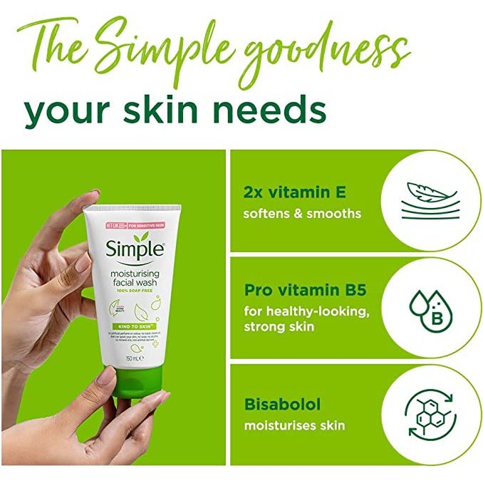 • Our Simple facial wash is made with skin-loving ingredients, such as pro-vitamin B5, vitamin E and Bisabolol, leaving your face feeling clean and refreshed.