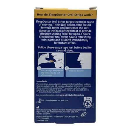SleepDoctor Oral Strips target everyday snoring by coating the throat to reduce vibration that leads to snoring. Their dual-action time-based formula tones and lubricates the soft tissue at the back of the throat to provide effective snoring relief for up to 8 hours. SleepDoctor Oral Strips have a refreshing mint taste and dissolve immediately for instant effect.