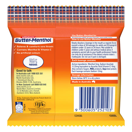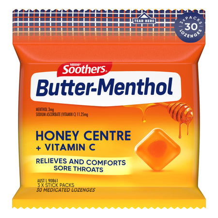 Butter-Menthol medicated lozenges combine mild menthol to actively relieve mild sore throats and stuffy noses, with a great distinctive taste Australians know and love. Also with the added goodness of Vitamin C and a delicious honey centre.