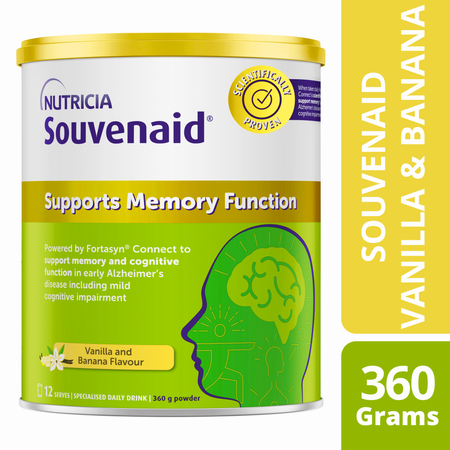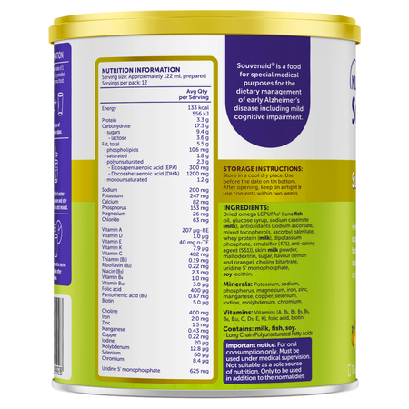 Souvenaid is food for special medical purposes for the dietary management of early Alzheimer's disease, including mild cognitive impairment. Important notice: For oral consumption only. Must be used under medical supervision. Not suitable as a sole source of nutrition. Only to be used in addition to the normal diet.