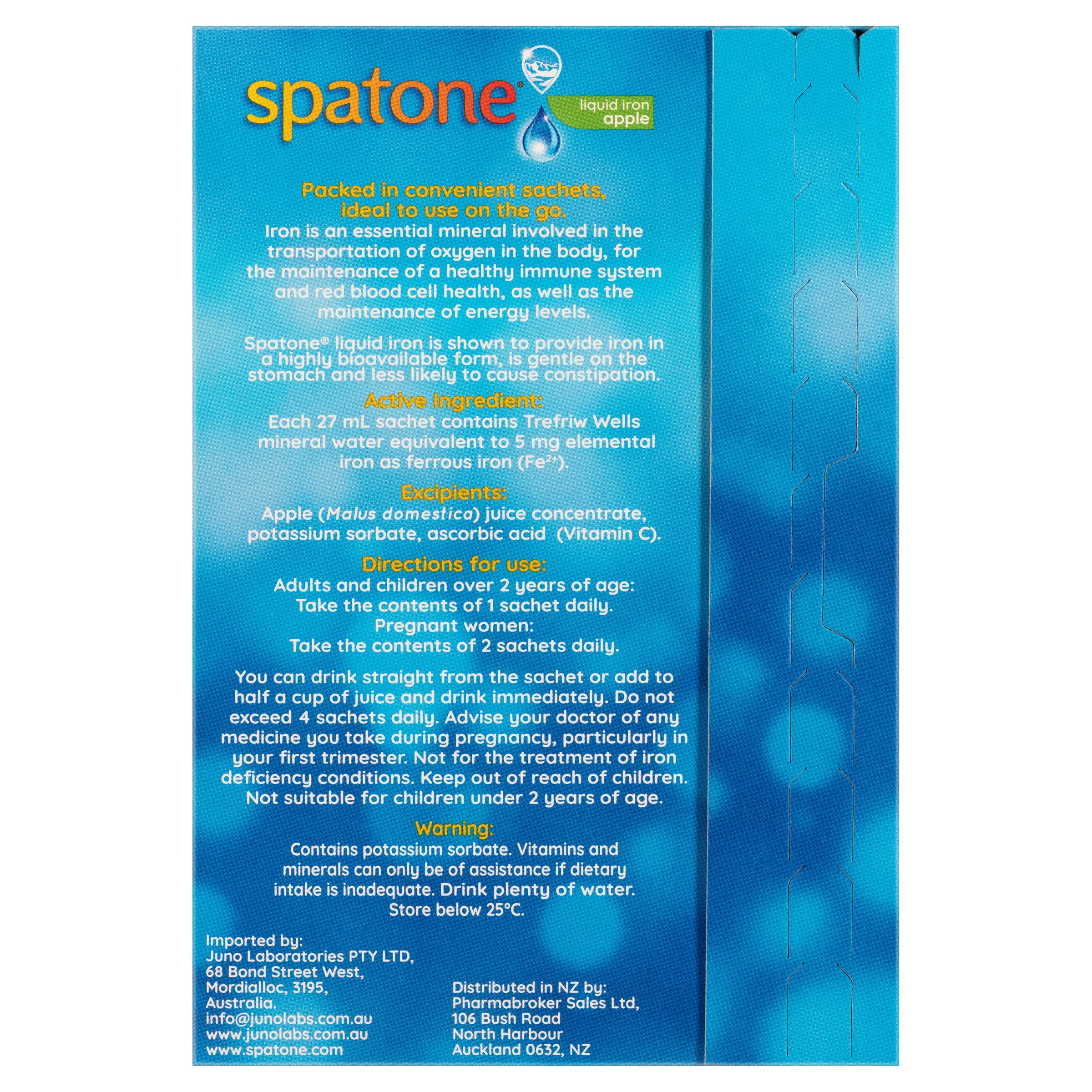 Spatone® liquid iron comes in easy to use sachets that you can either add to your favourite drink or take straight from the sachet. Spatone® Original is ideally taken diluted in fruit juice not only because it tastes but lighter coloured juices such as orange, apple, mango or pineapple are rich in Vitamin C which increases iron absorption. Our Spatone® Apple tastes great on its own and has added Vitamin C, which increases iron absorption.
