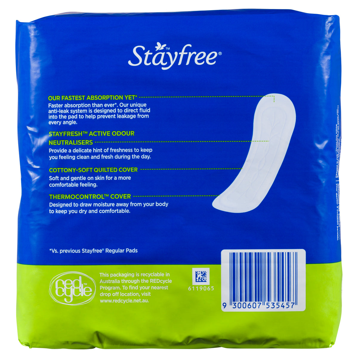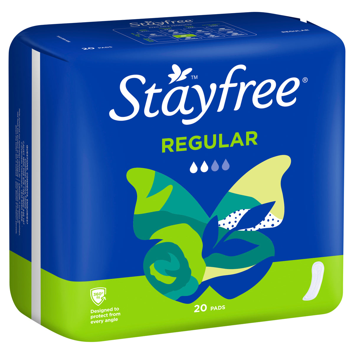 Comfortable protection is made even better by Stayfree Regular Pads. Designed to protect from every angle with a new look and 360 fit.