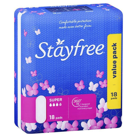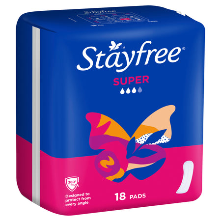 Stayfree Super Pads provide even better comfort and protection. The special 360 fit is designed to protect from every angle. Stay Protected Stayfree is designed for 360 fit to help protect against front, back and side leakage. Our unique 18 anti-leak channels are designed to direct the fluid into the pad to help prevent leakage from every angle. Stay Comfortable Stayfree's Cottony-Soft Quilted Cover is soft and gentle onskin, and Fast Lock Pockets absorb moisture rapidly and lock it away in an Advanced Anti-Leak Core. Stay Fresh Stayfreshactive odour neutralisers provide a delicate hint of freshness to keep you feeling clean and fresh so you can get on with the more important things in life. Stay Dry Only Stayfree has the Thermocontrol cover. Inspired by high-performance athleticwear (Stayfree pads are not made from the same material as athletic fabric), Thermocontrol cover is expertly designed to draw moisture away from the body to keep you dry and comfortable. |