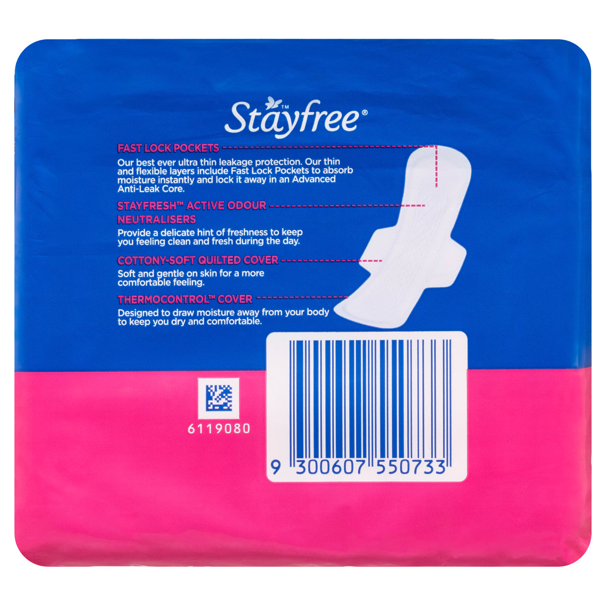 Stayfree Ultra Thin Super Pads With Wings give you even more comfortable protection. The Stayfree Perfect Fit Design provides 4 thin flexible layers that move with your body. Stay Protected Stayfree is designed for PerfectFit, inspired by athleticwear (Stayfree pads are not made from the same material as athletic fabric), for a whole new level of protection. Our best ever leakage protection (vscurrent Stayfree) with a blend of thin and flexible layers specifically designed to closely follow your body's movements to help you feel secure for longer without needing to adjust yourpad (vscurrent Stayfree). Stay Comfortable These sleek and slender Ultra Thin Pads With Wings are shaped for comfort. The Cottony-Soft Quilted Cover is soft and gentle onskin, and Fast Lock Pockets absorb moisture instantly and lock it away in an Advanced Anti-Leak Core. Stay Fresh Stayfreshactive odour neutralisers provide a delicate hint of freshness to keep you feeling clean and fresh during your day. Stay Dry Only Stayfree has the Thermocontrol cover which is designed to draw moisture away from the body to keep you dry and comfortable. |