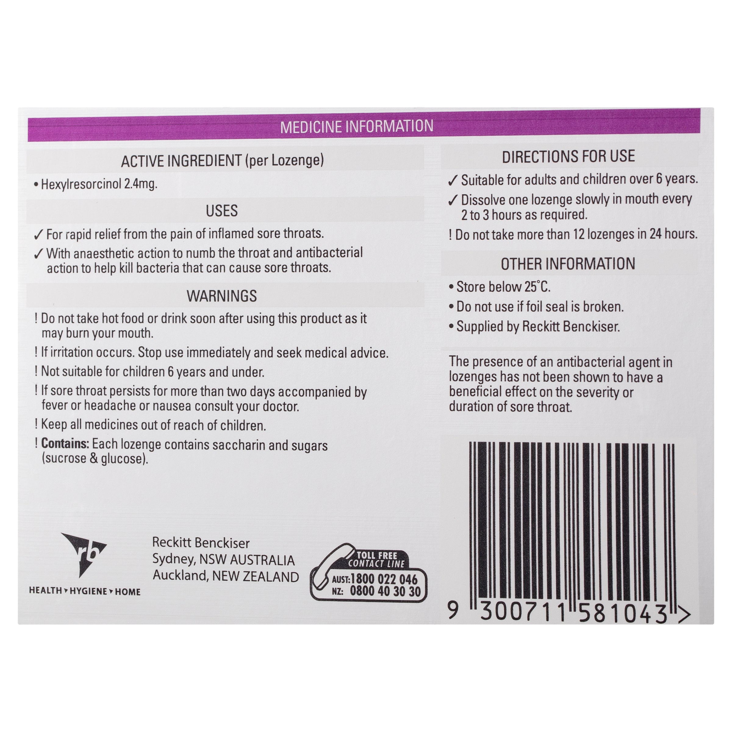 Active Ingredients: Hexylresorcinol 2.4mg.