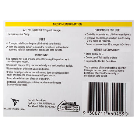 Do not use if foil seal is broken. Supplied by Reckitt Benckiser.The presence of an antibacterial agent in lozenges has not been shown to have a beneficial effect on the severity or duration of sore throat.