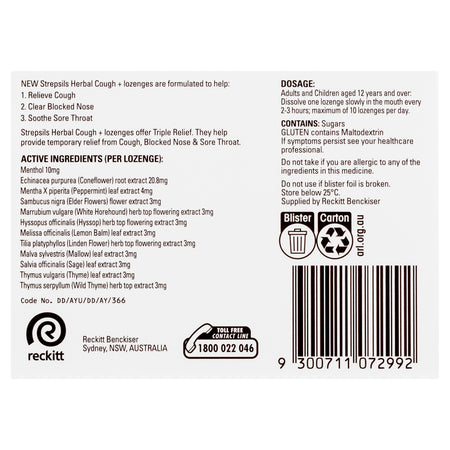 Strepsils Herbal Cough lozenges offer Triple Relief They help provide temporary relief from Cough Blocked Nose Sore ThroatSAFETY DIRECTIONS