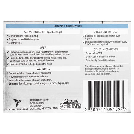 Supplied by Reckitt Benckiser.The efficacy of an antibacterial agent in lozenges in reducing the severity or duration of throat infections has not been clinically established.