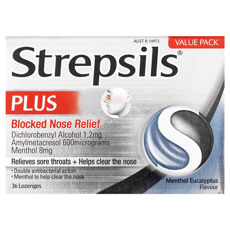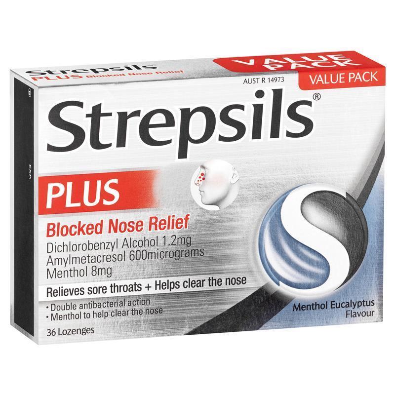 Strepsils Plus Blocked Nose Relief Menthol Eucalyptus relieves sore throats plus helps clear the nose. With double antibacterial action and menthol to help clear the nose.