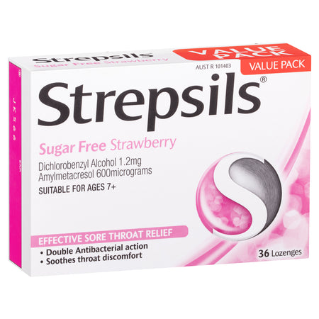 If you prefer a lozenge without sugar, try Strepsils Sugar Free Strawberry. These tasty little lozenges contain effective antibacterial agents (Dichlorobenzyl alcohol 1.2mg and Amylmetacresol 600µg) that relieve discomfort of a sore throat and minor mouth infections.