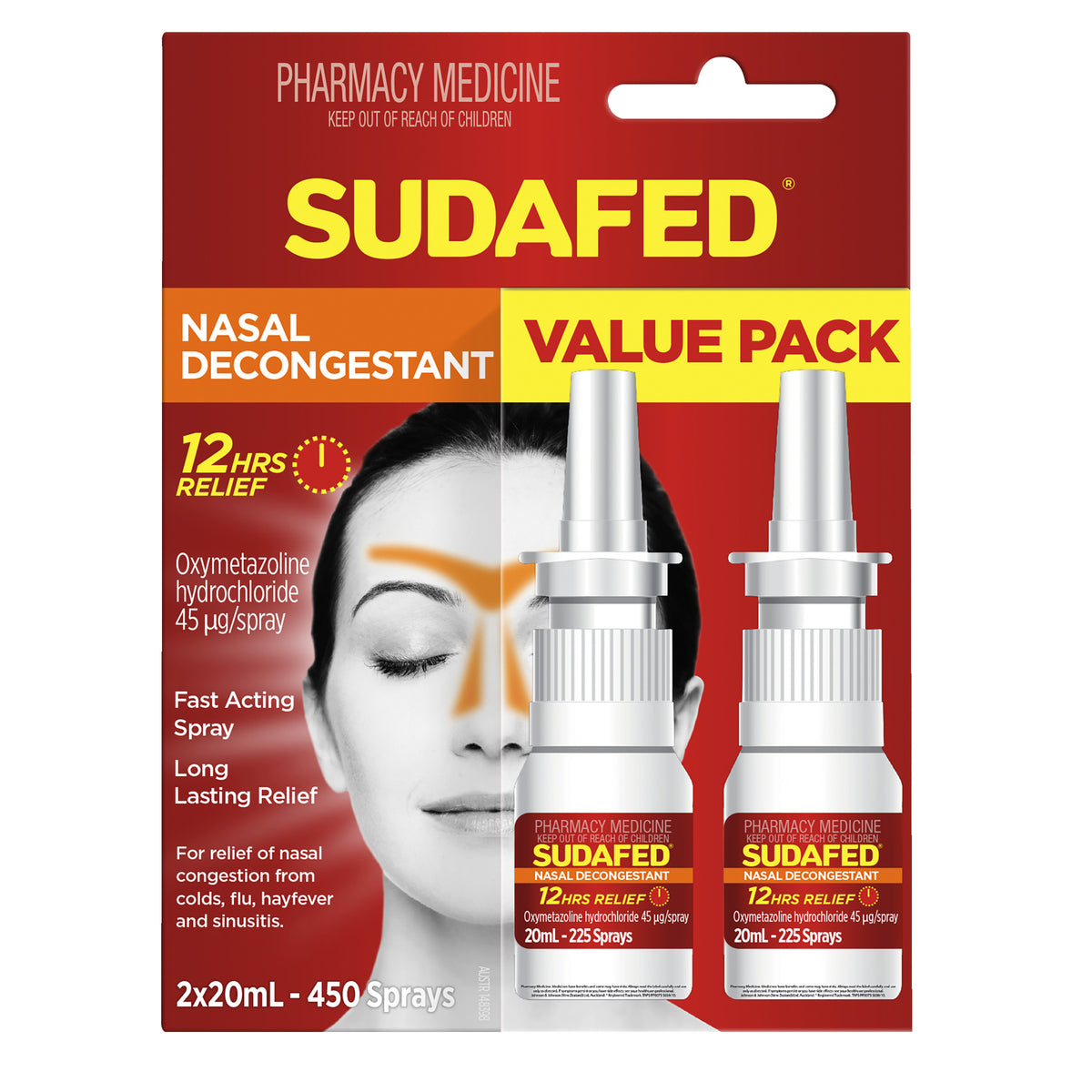 Sudafed Nasal Decongestant Spray is a fast acting nose spray which provides nasal & sinus congestion relief for sinusitis, flu & hayfever for up to 12 hour. Non pseudoephedrine decongestant that clears blockages and dries the secretions of the nose.