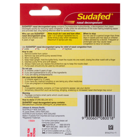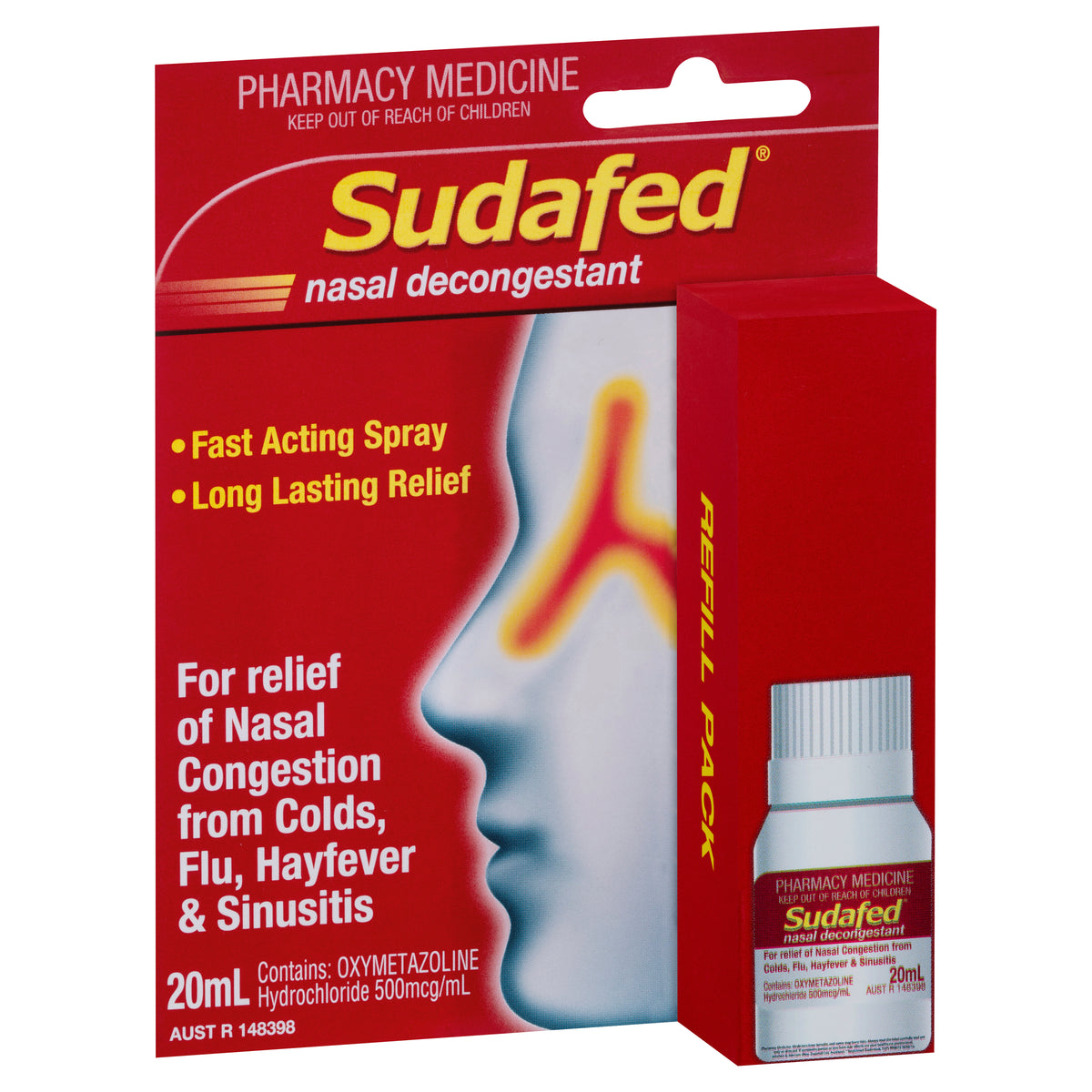 SUDAFED nasal decongestant spray contains Oxymetazoline hydrochloride, a decongestant that clears blockages quickly by reducing nasal congestion. It also dries the secretions of the nose making breathing easier and provides fast, long lasting effective relief for several hours.