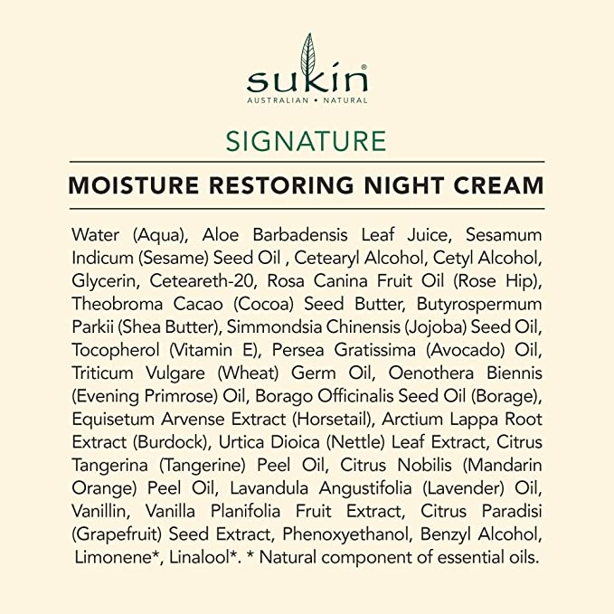 Water (Aqua), Aloe Barbadensis Leaf Juice, Sesamum Indicum (Sesame) Seed Oil , Cetearyl Alcohol, Cetyl Alcohol, Glycerin, Ceteareth-20, Rosa Canina Fruit Oil (Rose Hip), Theobroma Cacao (Cocoa) Seed Butter, Butyrospermum Parkii (Shea Butter), Simmondsia Chinensis (Jojoba) Seed Oil, Tocopherol (Vitamin E), Persea Gratissima (Avocado) Oil, Triticum Vulgare (Wheat) Germ Oil, Oenothera Biennis (Evening Primrose) Oil, Borago Officinalis Seed Oil (Borage), Equisetum Arvense Extract (Horsetail), Arctium Lappa Root Extract (Burdock), Urtica Dioica (Nettle) Leaf Extract, Citrus Tangerina (Tangerine) Peel Oil, Citrus Nobilis (Mandarin Orange) Peel Oil, Lavandula Angustifolia (Lavender) Oil, Vanillin, Vanilla Planifolia Fruit Extract, Citrus Paradisi (Grapefruit) Seed Extract, Phenoxyethanol, Benzyl Alcohol, Limonene*, Linalool*. * Natural component of essential oils