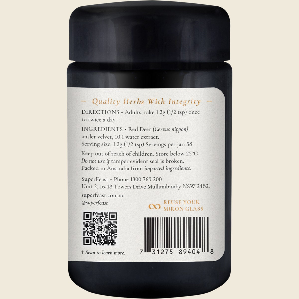 Harness the power of nature with Superfeast Deer Antler. This 70g supplement is rich in vital nutrients and traditionally used to promote overall wellness. With no added fillers or preservatives, enhance your health and vitality with our all-natural formula. Trust in the wisdom of nature and experience the benefits for yourself.