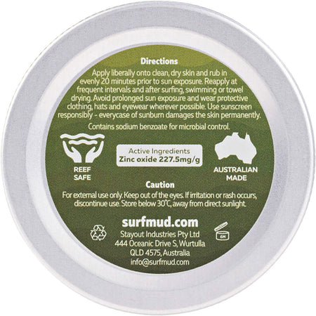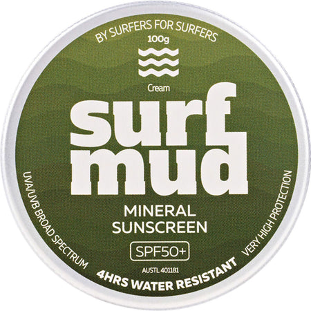 Surfmud's Mineral Sunscreen is SPF50+, reef-safe, fragrance-free, and 4 hours water-resistant. Contains no chemical UV filters or preservatives. It's in a tin for added convenience!