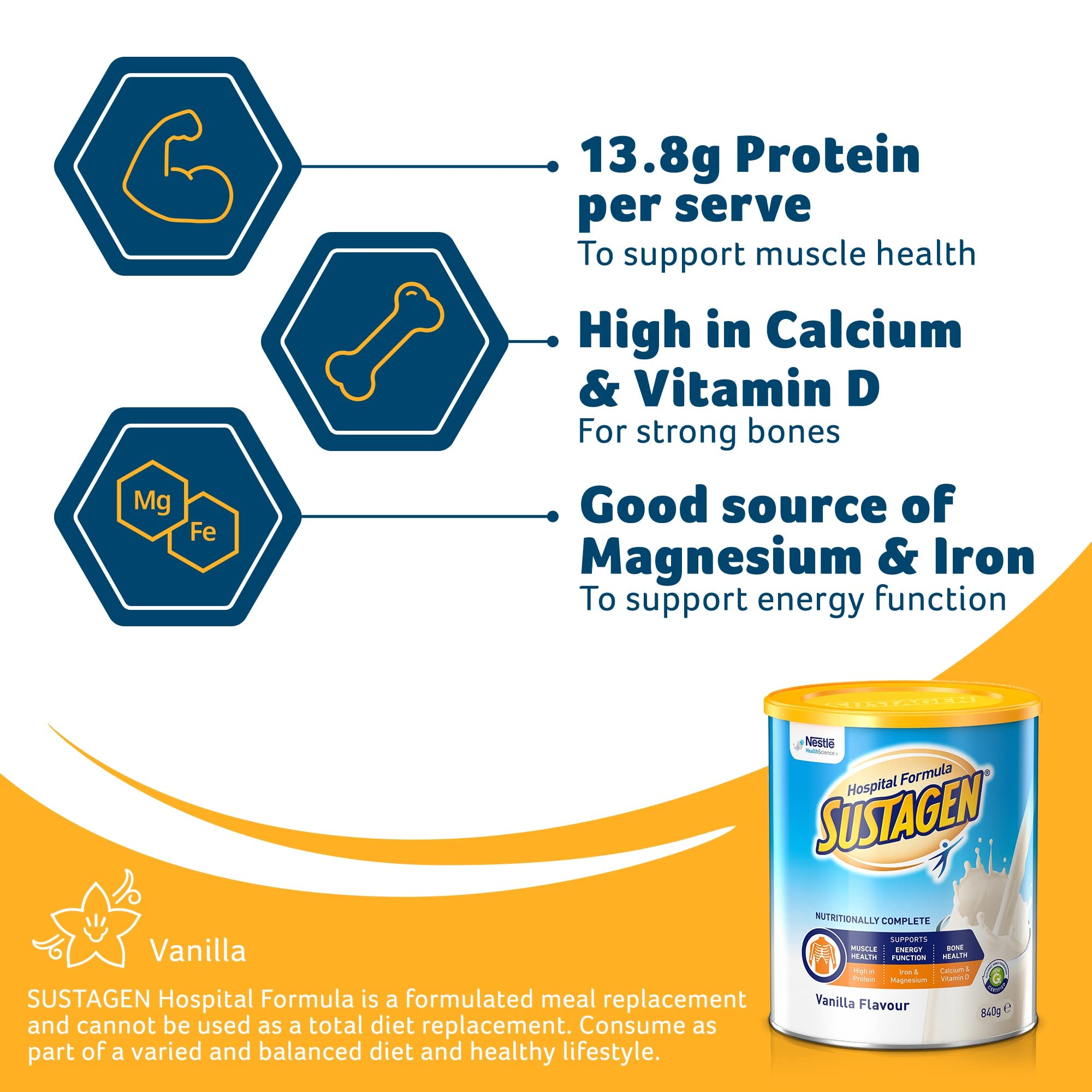 When mixed as per instructions with 200mL water. Nutrition Information for Sustagen® Hospital range Vanilla only – for Chocolate varieties please refer to the product.