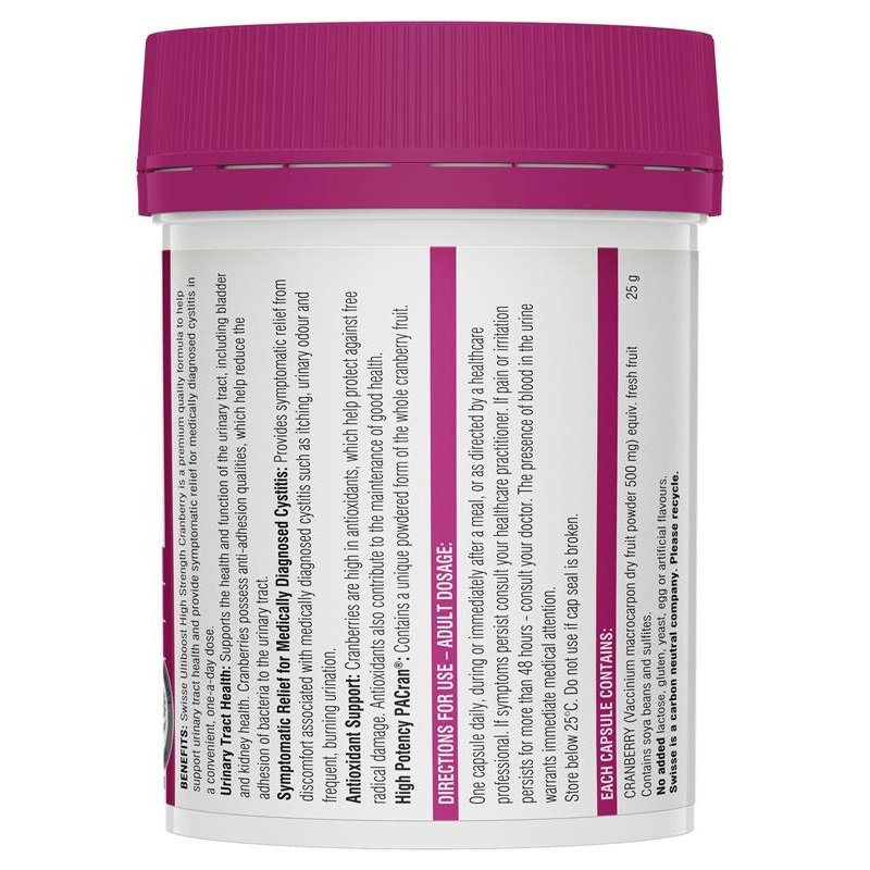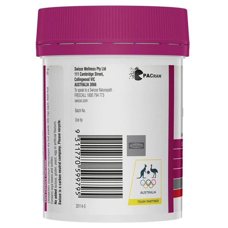 Swisse Ultiboost High Strength Cranberry contains PACran, a high-potency cranberry powder that is a unique powdered form of whole cranberry fruit, without juice.