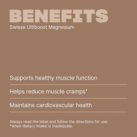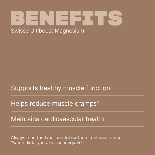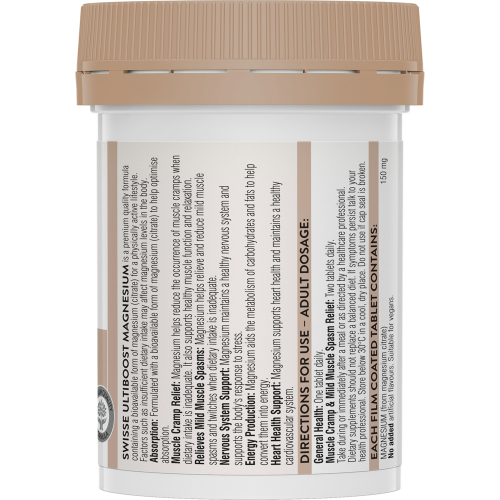 BENEFITS: Swisse Ultiboost Magnesium is a premium quality formula containing a bioavailable form of magnesium (citrate) to support a physically active lifestyle. Factors such as diet and excess alcohol intake may also reduce magnesium levels.Absorption: Formulated with a bioavailable form of magnesium (citrate) to help optimise absorption.