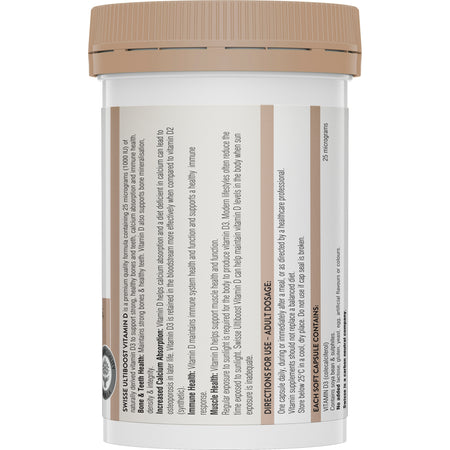 Swisse Ultiboost Vitamin D is a premium quality formula containing 1000 IU of naturally derived vitamin D3 to support bone and teeth health.
