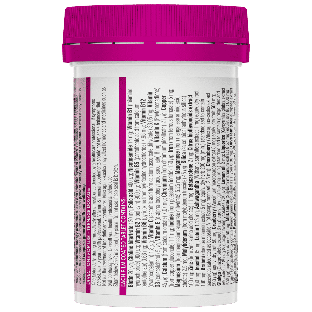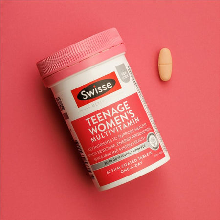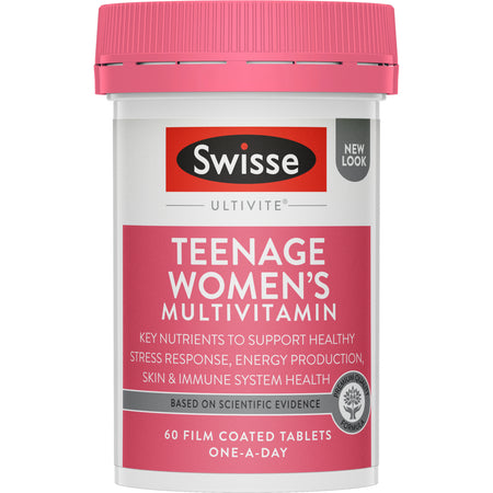 Swisse Teenage Women's Ultivite is a premium quality formula multivitamin containing 38 vitamins, minerals, antioxidants and herbs tailored for teenage girls to support energy production, healthy skin, immune function and support during stress.