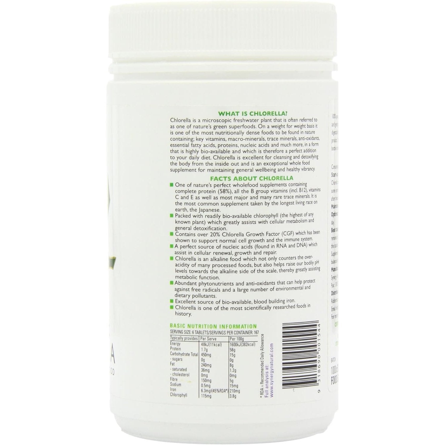Best taken at or after meals with plenty of fluid (preferably pure water to assist the removal of toxins). You can take Chlorella with every meal or once a day. Perfect as a broad spectrum green superfood when mixed with Synergy Spirulina.