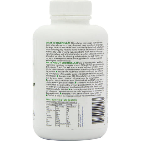 • Chlorella is an alkaline food which may not only counter the over-acidity of many processed foods, but may also help raise our bodily pH levels towards the alkaline side of the scale, thereby greatly assisting metabolic function.