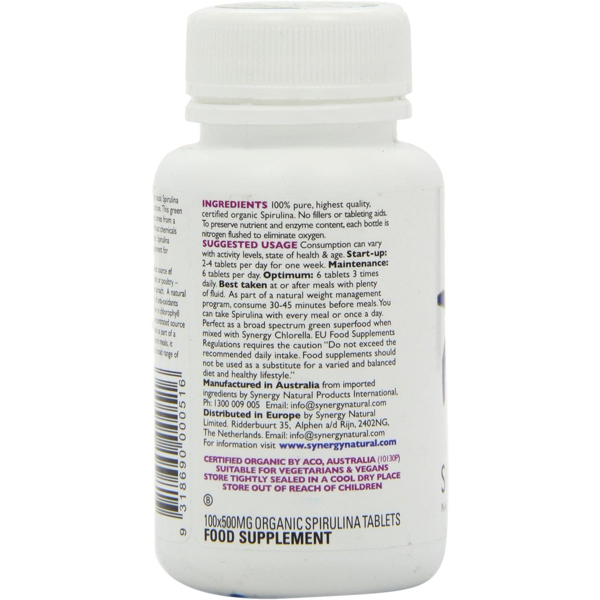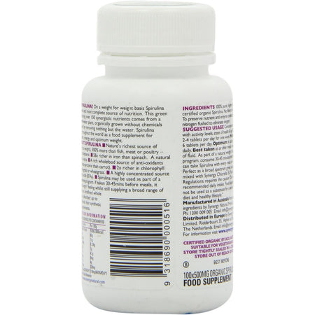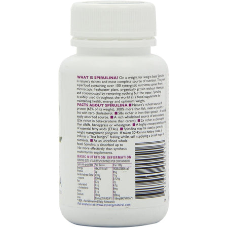 Consumption can vary with activity levels, state of health & age. Start-up: 2–4 tablets per day for one week. Maintenance: 6 tablets per day. Optimum: 6 tablets, 3 times daily. Best taken at or after meals with plenty of fluid. As part of a natural weight management program, consume 30–45 minutes before meals. You can take Spirulina with every meal or once a day. Perfect as a broad spectrum green superfood when mixed with Synergy Chlorella. EU Food Supplements Regulations requires the caution “Do not exceed the recommended daily intake. Food supplements should not be used as a substitute for a varied and balanced diet and healthy lifestyle.”