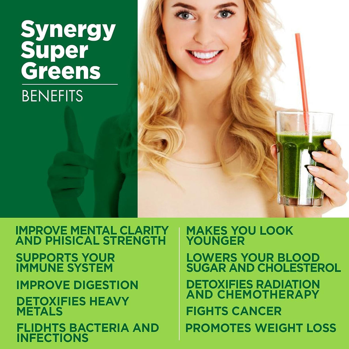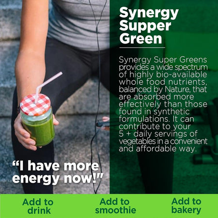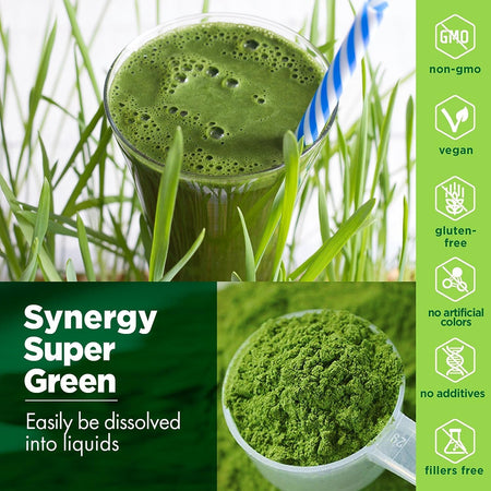 Synergy Super Greens is a synergistic blend of Nature’s most nutrient dense green superfoods: Spirulina, Chlorella, Barley Grass and Wheat Grass. It provides a wide spectrum of highly bioavailable whole food nutrients, balanced by Nature and absorbed more effectively than those found in synthetic formulations.