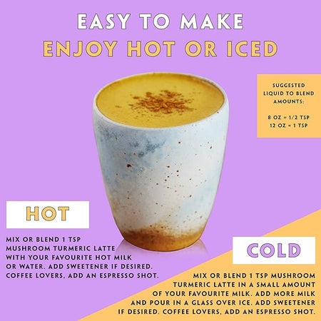Enjoy this instant golden Turmeric Latte blend with organic Cordyceps mushroom and spices. Stay fit, happy and energised all day long without the crash. Turmeric lattes make a delicious coffee alternative or the perfect upgrade to your tea, chai latte, smoothies, soup and other recipes.