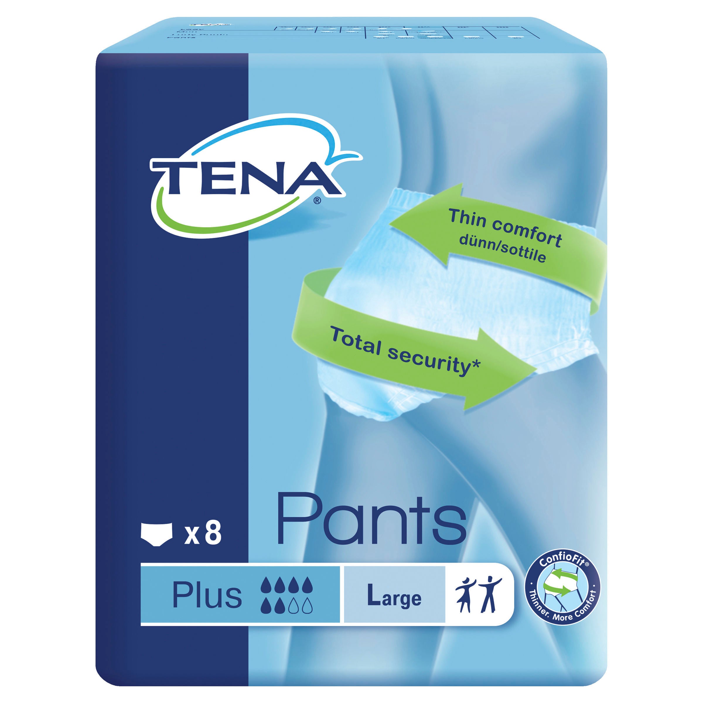 TENA Pants Plus (Size L) is our disposable incontinence pants for men and women with pull up fit. They look and feel just like regular underwear but are super absorbent and offer triple protection for heavy leaks.