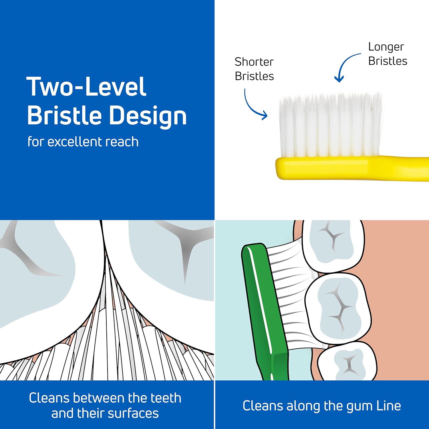 - Two levels of bristles: the short bristles reliably clean the tooth surfaces, while the longer ones clean between the teeth as well as along the gum line for optimal dental hygiene