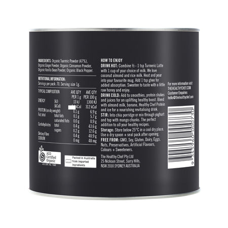 The Healthy Chef Turmeric Latte is a delicious certified organic blend of turmeric, cinnamon, ginger, and wild vanilla bean. Turmeric is rich in antioxidants that help to support health and well-being.