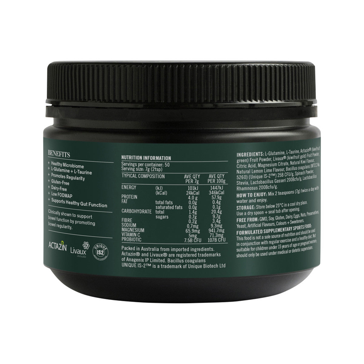 L-Glutamine, L-Taurine, Actazin® (kiwifruit green) Fruit Powder, Livaux® (kiwifruit gold) Fruit Powder,Citric Acid, Magnesium Citrate, Natural Kiwi Flavour, Natural Lemon Lime Flavour, Bacillus coagulans (MTCC No.